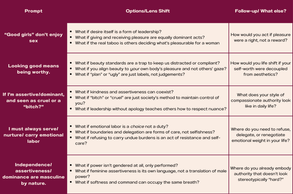 - How will you reclaim “femininity” (or womanhood, or identity) on your own terms — what practices or habits will you build as resistance?