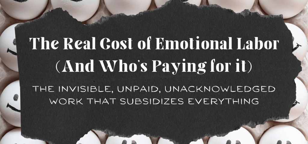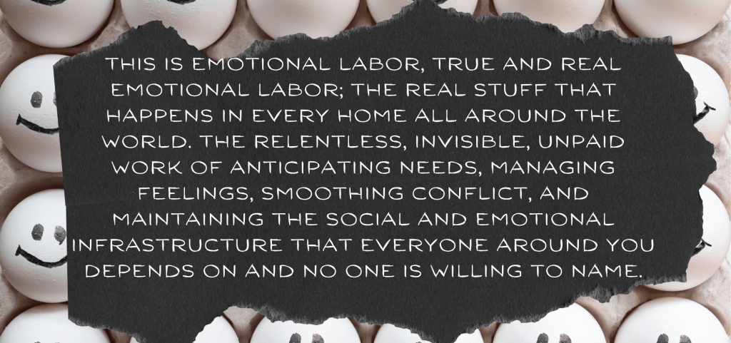 Sociologist Arlie Russell Hochschild coined the term “emotional labor” in 1983 to describe something specific: the management of feelings as a job requirement, sold for a wage. Hochschild study identified this emotional labor in the workplace, but it’s just the tip of an iceberg that extends deep into every kitchen, every relationship, every family group text, and every office where a woman is expected to be the one who “keeps the peace.”
