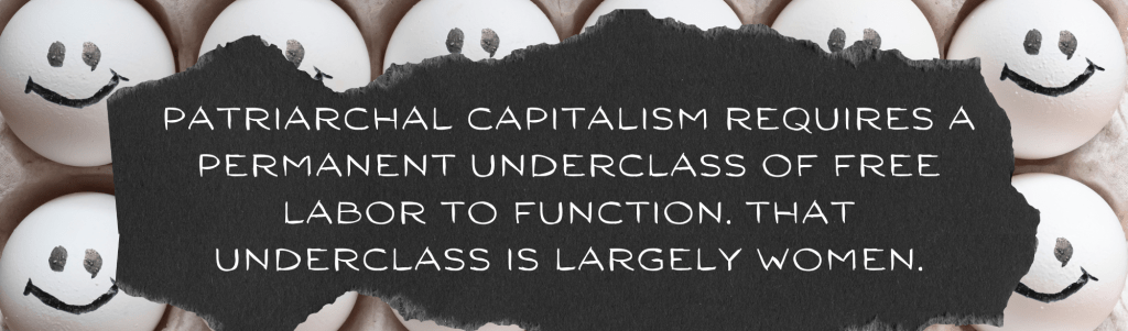 Patriarchal capitalism requires a permanent underclass of free labor to function. That underclass is largely women. The entire structure of the modern economy, from the length of the workday to the design of the school calendar to the assumption that someone is always available to manage a sick child, is built on the premise that an invisible person (a woman) is absorbing the costs that the market refuses to pay.