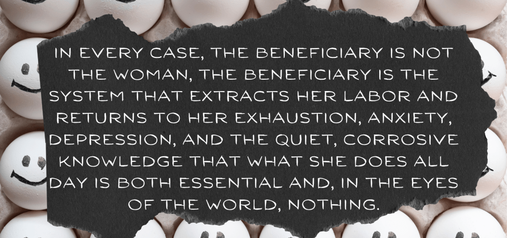 In every case, the beneficiary is not the woman, the beneficiary is the system that extracts her labor and returns to her exhaustion, anxiety, depression, and the quiet, corrosive knowledge that what she does all day is both essential and, in the eyes of the world, nothing.