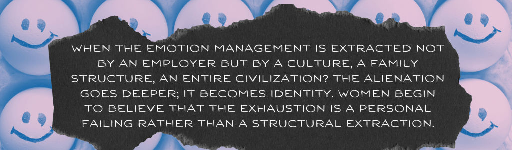 Sociologist Arlie Hochschild was precise about this: when emotional labor is commodified, when feelings become a product sold for a wage, the worker risks alienation from her own emotional life. Flight attendants she interviewed described their smiles as being on them but not of them. But what happens when the same dynamic operates without even the dignity of a paycheck? When the emotion management is extracted not by an employer but by a culture, a family structure, an entire civilization? The alienation goes deeper; it becomes identity. Women begin to believe that the exhaustion is a personal failing rather than a structural extraction.