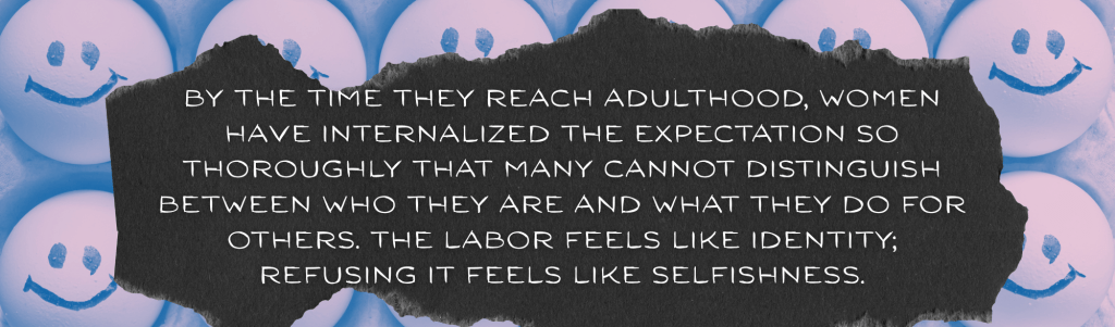 The gendered distribution of emotional labor is not a product of biology. It is a product of training, training that begins in childhood and is reinforced at every stage of life by every institution women encounter.
